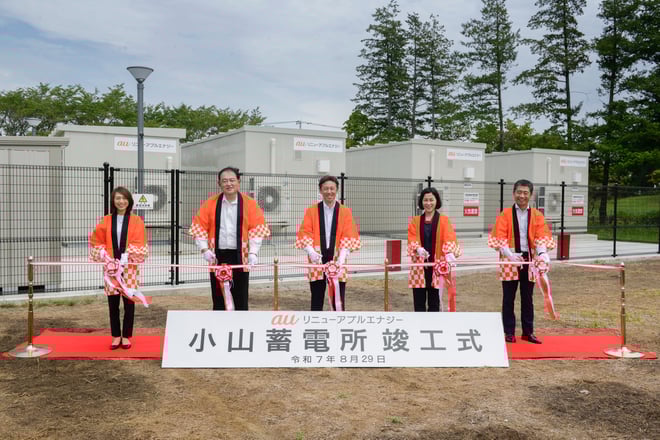 auリニューアブルエナジー株式会社(本社:東京都千代田区、代表取締役社長:鈴木 吾朗、以下auリニューアブルエナジー)、KDDI株式会社(本社:東京都港区、代表取締役社長CEO:松田 浩路、以下 KDDI)、東京電力ホールディングス株式会社(本社:東京都千代田区、代表執行役社長:小早川 智明、以下 東京電力ホールディングス)が建設を進めてきたKDDI小山ネットワークセンター(栃木県小山氏)内の「小山蓄電所」(蓄電池出力1,999kW、蓄電池容量5,608Wh、以下 本蓄電所)について、2025年8月15日からauリニューアブルエナジーを蓄電池事業者として、運転および電力市場取引を行う蓄電池事業(以下 本事業)を開始しました。
